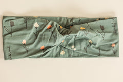 Twist-front headband featuring various affirmations among a wildflower pattern.