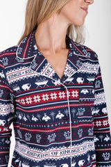 Bring beauty and meaning to your Christmas season with our King of Kings Notch Collar Pajama Set—soft, elegant, and designed for comfort you’ll reach for all December long. Inspired by a cozy Nordic sweater, the print pairs deep holiday tones with fair-isle rows of crowns, manger icons, angels, lambs, stars, and the words KING OF KINGS—a joyful reminder that the baby in the manger is the King who came to save. It’s a polished, Christ-centered look that feels as good as it photographs, perfect for family traditions, Scripture reading, and quiet evenings at home.