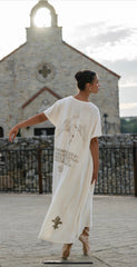 100% Cotton, One Size fits Most, Chic flowing t-shirt dress. St. Joan of Arc print on the front. Holy sprit dove and quote on the back. Brown military color print on white cotton dress.