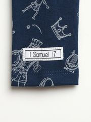 Featuring a new daywear version of one of our most-loved prints, this design showcases Davidās courage, his sling, and the power of trusting in the Lord. The darker background adds a fresh, modern look thatās both practical and stylish for babies on the go.