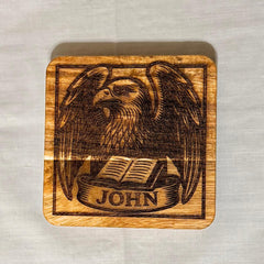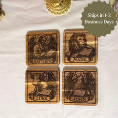 These wooden evangelist coasters make a beautiful handmade religious gift perfect for priests, seminary students, or as thoughtful dorm decor for those studying theology. The set features traditional laser engraved biblical symbols representing the Four Evangelists, creating meaningful scriptural design elements that enhance any Catholic home with distinctive Christian art. It is a meaningful acacia wood coaster set featuring the Four Evangelists