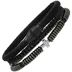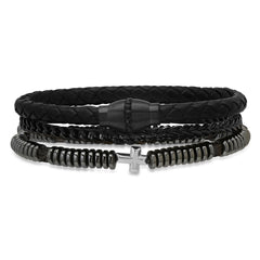 An edgy 3-piece bracelet set blending black braided leather, black IP stainless steel, simulated black diamonds, hematite, and lava beads—dark, bold, and built to stand out.