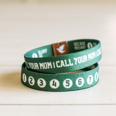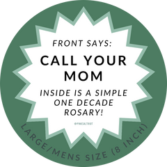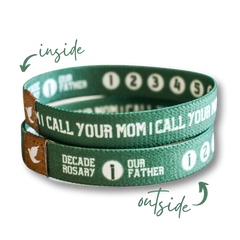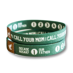 Crafted with high-quality elastic, each bracelet features a practical one decade rosary design inside with the repeating words "Call your mom" on the outside.