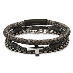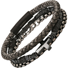 Gray Braided Leather/Black Ip Stainless Steel, Stainless Steel Round Link And Hematite/Lava Beaded 3Pc Bracelet Set