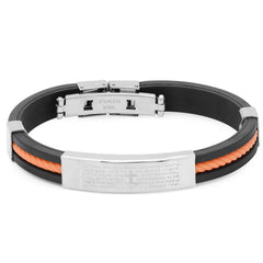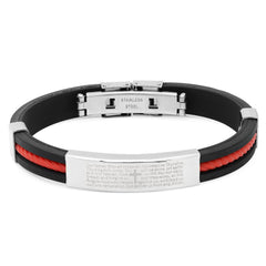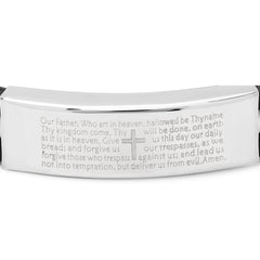 The basic ID Bracelet, remixed. This bracelet has a center plate with the Lord's prayer laser embossed. There is contrasting center rope detailing and metal spacer accents on either side with a fold-over closure.