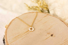 Chain is 18K gold plated stainless steel, 18 inches long.