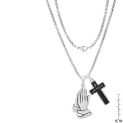 A sleek stainless steel and black enamel cross featuring "Jesus," paired with detailed prayer hands pendants — a bold yet meaningful expression of faith and style.