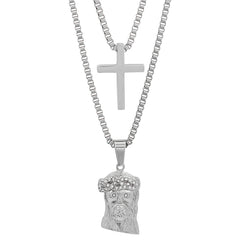 Elevate your collection with our double pendant necklace, showcasing a Jesus with Simulated Diamonds and a High-Polished Cross. This necklace serves as a perfect statement piece, reflecting your faith and adding a touch of elegance to your ensemble.