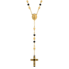This two tone black ip and stainless steel beaded rosary features an oval pendant rosary is intricately laser engraved accents on the cross pendant. A rosary necklace is truly something special, all known as a sacred piece of jewelry that is worn for religious protection & prayer.