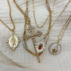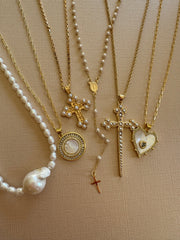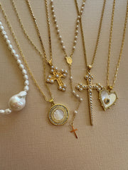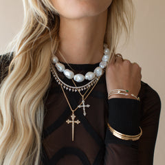 Elevate your look with our Athena Pearl Cross Pendant Necklace. Featuring a gold elongated cross adorned with luminous pearls, this piece blends timeless faith with modern elegance. Perfect for layering or wearing solo, it’s a radiant symbol of strength and style.