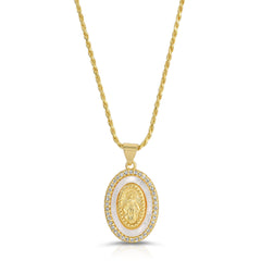 Graceful and timeless, the Holy Mother Mary Silhouette Pendant Necklace features a luminous Mother of Pearl inlay with a delicate Virgin Mary silhouette at its center. Symbolic and serene, this piece is designed to pair beautifully with the classic Mother Mary Necklace for a layered look that’s both meaningful and elegant.