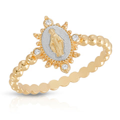 Deepen the faith with the Lady Lourdes Ring. Features a dainty ball band highlighting a portrait of the Virgin Mary surrounded by ornamental CZ accents and embellished spike details. Perfect neutral for your daily stack of rings.
