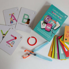 On the front of each double-sided card children will discover the magical water reveal of an item found inside a Catholic Church. On the back is a beautiful illustration of a beloved Saint that starts with the corresponding letter.