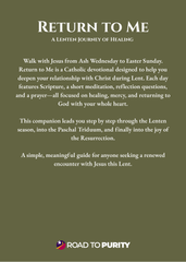Return to Me is a daily Lenten prayer guide inviting you to walk with Jesus from Ash Wednesday to Easter Sunday through a season of deep reflection, healing, and renewal. Rooted in Sacred Scripture and the rich spiritual tradition of the Catholic Church, this devotional gently leads the heart back to God—one day, one prayer at a time.