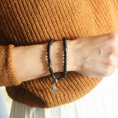 This beautiful gemstone rosary bracelet features skull beads as the paters and black onyx matte beads as the aves. Each of our stretch and wrap rosary bracelets is a full rosary.  Each bracelet also includes a “bookmark” crucifix charm.  This charm is moveable and can help you keep track of where you are at in your rosary as you pray throughout your day.