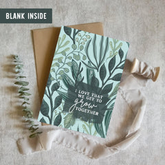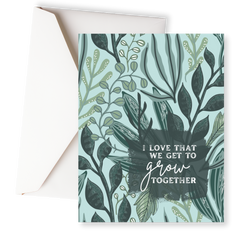 Share the joy of growing together with this heartwarming card. Ideal for friends, significant others, and more, this glossy 5.5 x 4.5 card features a blank matte interior and sturdy card stock. Keep it on hand for any occasion and it comes with a white envelope.