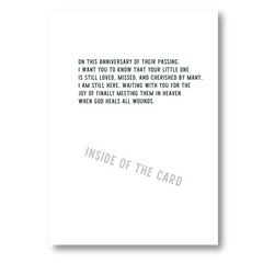 Inside says: "On this anniversary of their passing, I want you to know that your little one is still loved, missed, and cherished by many. I am still here, waiting with you for the joy of finally meeting them in heaven when God heals all wounds."