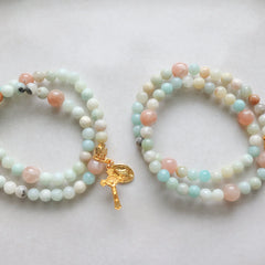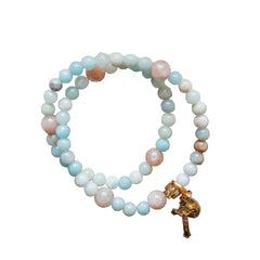 This beautiful gemstone rosary bracelet features light green Amazonite beads as the paters and multi-colored amazonite beads as the aves. Each of our stretch and wrap rosary bracelets is a full rosary. Small rosary bracelets do not include the first three aves. Each bracelet also includes a “bookmark” crucifix medal. This medal is moveable and can help you keep track of where you are at in your rosary as you pray throughout your day.