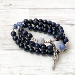 This beautiful gemstone rosary bracelet features Sodalite beads as the paters and blue Goldstone beads as the aves. Each of our stretch and wrap rosary bracelets is a full rosary. Each bracelet also includes a “bookmark” crucifix medal. This medal is moveable and can help you keep track of where you are at in your rosary as you pray throughout your day.