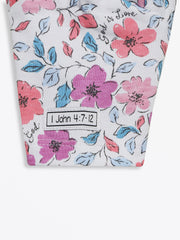 • Whimsical Floral Design: Features a dainty, hand-drawn floral print in soft purples and pinks, interwoven with the gentle reminder that "God is Love".