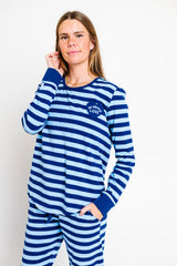 This Women's Long Sleeve Jogger Set includes a crew neck top with a heart-shaped pocket and elastic-waist pants, both made from high-quality 100% Premium Cotton fabric. It features our exclusive blue stripe design and the unique Scripture label detail on the sleeve cuff. Available in sizes XS–XXL.