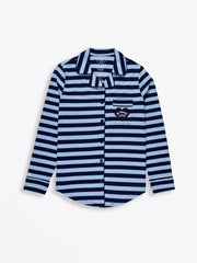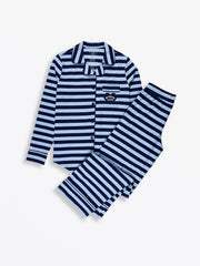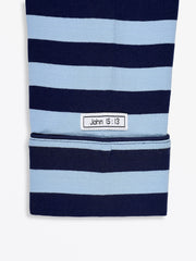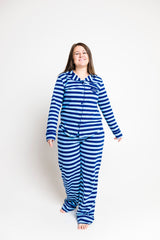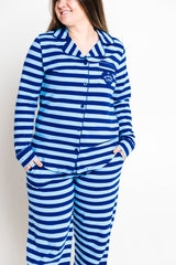 This Women's Notch Collar Pajama Set includes a long-sleeve, button-up top with a heart pocket and relaxed-fit pants, both made from our high-quality 100% Premium Cotton fabric. It features the exclusive blue stripe print and the signature Scripture label on the cuff. Available in sizes XS–XXL.