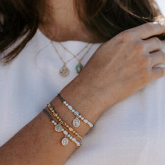 - Adjustable slate grey bracelet cording which opens to 9.5" circumference