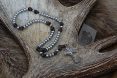 Our handmade rosaries are made with the strongest leather cord available in the USA. This Silver Fox Rosary is made with metal beads, and a beautiful benedictine cross.