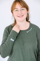 Rooted and serene, this rich olive solid with subtle “God is good” detailing whispers gratitude into the everyday. The comfy rib knit invites lingering cuddles and unhurried moments, while the message keeps hearts set on God’s goodness in every season. A timeless basic that pairs with anything—and points to praise. Inspired by Psalm 107:1.