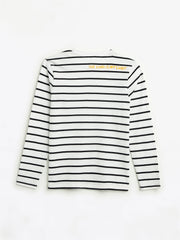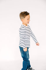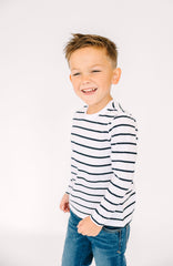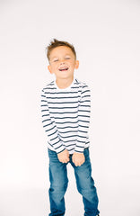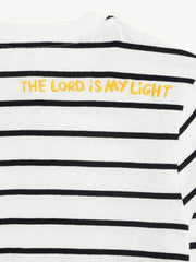 A timeless stripe with a radiant message: “The Lord is my light” (Psalm 27:1), embroidered on the back in a childlike script. Easy to dress up or down, it’s a daywear favorite that keeps Scripture close.